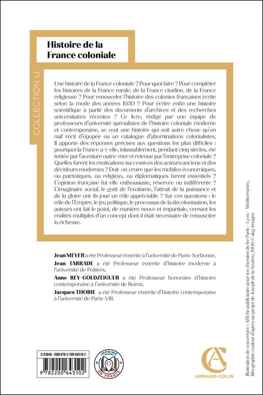 Une histoire de la France coloniale ? Pour quoi faire ? Pour compléter les histoires de la France rurale, de la France citadine, de la France religieuse ? Pour renouveler l’histoire des colonies françaises écrite selon la mode des années 1930 ? Pour écrire enfin une histoire scientifique à partir des documents d’archives et des recherches universitaires récentes ? Ce livre, rédigé par une équipe de professeurs d’université spécialistes de l’histoire coloniale moderne et contemporaine, se veut une histoire qui soit autre chose qu’un naïf récit d’épopée ou un catalogue d’abominations colonialistes. Il apporte des réponses précises aux questions les plus difficiles : pourquoi la France a-t-elle, inlassablement, pendant cinq siècles, été tentée par l’aventure outre-mer et retenue par l’entreprise coloniale ? Quelles furent les motivations successives des acteurs anciens et des décideurs modernes ? Doit-on croire que les mobiles économiques, ou patriotiques, ou religieux, ou diplomatiques furent essentiels ? L’opinion française fut-elle enthousiaste, réservée ou indifférente ? L’imaginaire social, le goût de l’exotisme, l’attrait de la puissance et de la gloire ont-ils joué un rôle appréciable ? Sur ces questions : le rôle de l’Empire, le jeu politique, le processus de la décolonisation, les auteurs ont fait le point, de manière neuve et impartiale, cernant les réalités multiples d’un concept dont il était nécessaire de ressusciter la richesse.