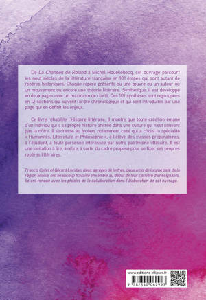 De La Chanson de Roland à Michel Houellebecq, cet ouvrage parcourt les neuf siècles de la littérature française en 101 étapes qui sont autant de repères historiques. Chaque repère présente ou une œuvre ou un auteur ou un mouvement ou encore une théorie littéraire. Synthétique, il est développé en deux pages avec un maximum de clarté. Ces 101 synthèses sont regroupées en 12 sections qui suivent l’ordre chronologique et qui sont introduites par une page qui en définit les enjeux.