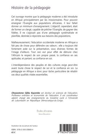 Cet ouvrage montre que la pédagogie moderne a été introduite en Afrique principalement par les missionnaires. Pour pouvoir enseigner l'Evangile aux populations africaines, il leur fallait donner un minimum d'enseignement. L'objectif, cependant, était de former un clergé capable de prêcher l'Evangile et de gagner des fidèles. Malheureusement, l'éducation occidentale moderne en Afrique a fait peu de chose pour défendre ces valeurs. Tout ceci eut pour effet de détruire chez l'Africain le respect de son propre passé, la confiance en ses aptitudes et sa confiance en soi. La pédagogie en Afrique a donc pour tâche particulière de rétablir ces deux qualités vitales essentielles.