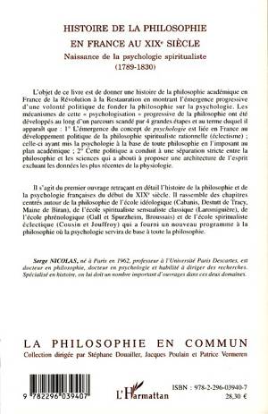 Cet ouvrage est le premier à retracer en détail l'histoire de la philosophie, de la psychologie et de leurs relations, de la Révolution à la Restauration. Il consacre des chapitres aux différentes écoles de pensée de l'époque : la philosophie de l'école idéologique (Cabanis, Destutt de Tracy, Maine de Biran), de l'école spiritualiste sensualiste classique (Laromiguière), de l'école phrénologique (Gall et Spurzheim, Broussais) et de l'école spiritualiste éclectique (Cousin et Jouffroy).