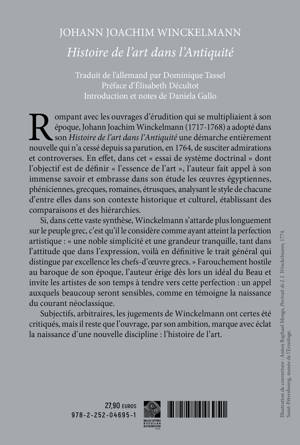 Rompant avec les ouvrages d’érudition qui se multipliaient à son époque, Johann Joachim Winckelmann (1717-1768) a adopté dans son Histoire de l’art dans l’Antiquité une démarche entièrement nouvelle qui n’a cessé depuis sa parution, en 1764, de susciter admirations et controverses. En effet, dans cet « essai de système doctrinal » dont l’objectif est de définir « l’essence de l’art », l’auteur fait appel à son immense savoir et embrasse dans son étude les oeuvres égyptiennes, phéniciennes, grecques, romaines, étrusques, analysant le style de chacune d’entre elles dans son contexte historique et culturel, établissant des comparaisons et des hiérarchies.