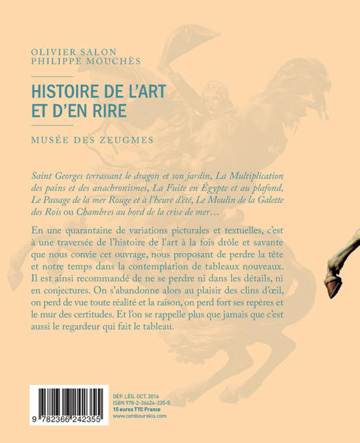 Une approche décalée de l'histoire de la peinture, illustrée par un commentaire en forme de zeugme littéraire, proposée par deux complices de l'Oulipo et de l'Oupeinpo. Une quarantaine de tableaux mondialement connus, détournés avec humour ; autant de zeugmes visuels (en page de gauche) accompagnés d'une variation littéraire humoristique (en page de droite) prétexte à expliciter l'ampleur des possibilités de cette figure de style reposant sur l'association de deux termes de nature différente. Une lecture à la fois cocasse et intelligente, dans la lignée des «(Vraies!) Histoires de l'art» (éditions Palette, 2012).