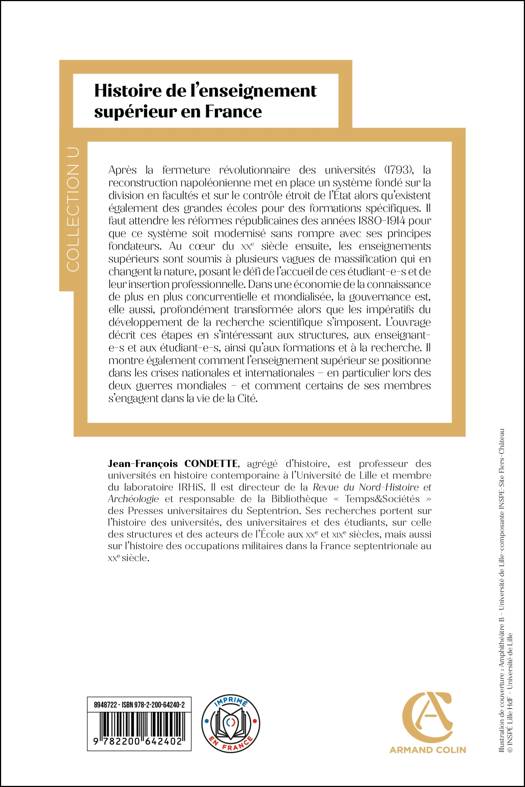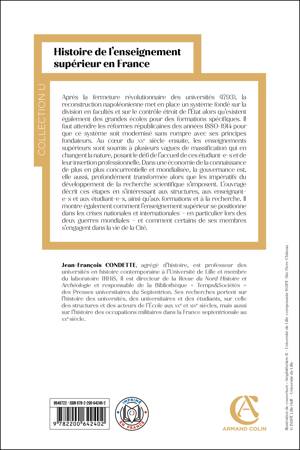 Cet ouvrage propose une synthèse inédite sur une histoire de l’enseignement supérieur en France de 1800 à nos jours en présentant systématiquement les acteurs, les contenus et les formations dans le cadre de l’histoire sociale et politique du temps. À ce titre deux chapitres, jamais étudiés dans les synthèses sur ce sujet, sont proposés, l’un sur l’enseignement supérieur pendant la Première Guerre mondiale, l’autre sur ce même enseignement pendant la Seconde Guerre mondiale. Il s’agit de dégager, sur plus de 220 ans, les grandes étapes de fondation et de rénovation de cet enseignement, mais aussi d’insister sur les continuités et les « mouvements de fond » qui le caractérisent. La hausse progressive des effectifs étudiants, leur féminisation, l’affirmation de la recherche scientifique, la professionnalisation des formations sont ainsi des tendances lourdes tout comme l'engagement des acteurs universitaires dans la vie de la cité et dans les grands débats politiques de l'époque, l’internationalisation progressive des institutions. L’auteur propose ainsi la description des événements de mai-juin 1968, de leurs causes et de leurs effets sur le monde de l’enseignement supérieur. Ce tableau sur la longue durée ne traite pas seulement (comme les autres ouvrages) des universités, mais intègre également les « autres enseignements supérieurs » (écoles de commerce, de gestion, écoles d’ingénieurs, classes préparatoires aux grandes écoles, grandes écoles, etc.). Il permet de disposer des clés de lecture d’un système français d’enseignement supérieur complexe et désormais fréquenté par une grande partie de la jeunesse du pays.