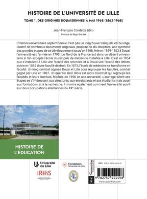 L’histoire universitaire septentrionale n’est pas un long fleuve tranquille et l’ouvrage, illustré de nombreux documents originaux, propose en dix chapitres, une synthèse des grandes étapes de ce développement jusqu’en 1968. Née en 1559-1562 à Douai, l’université est fermée en 1793. Le Nord de la France est alors un désert universitaire si l’on excepte l’école municipale de médecine installée à Lille. C’est en 1854 que s’installent à Lille une faculté des sciences et à Douai une faculté des lettres, suivie en 1865 d’une faculté de droit. En 1875, l’école de médecine se transforme en faculté. Un long combat oppose Douai et Lille pour regrouper les facultés, combat gagné par Lille en 1887. Un quartier latin lillois est alors construit qui regroupe les facultés et leurs instituts, fédérés en 1896 en une université. L’ouvrage décrit ces étapes en s’intéressant aux structures, aux enseignants et aux étudiants mais aussi aux formations et à la recherche. Il montre également comment l’université survit aux deux occupations allemandes du XXe siècle.