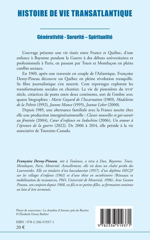 L'ouvrage présente une vie tissée entre France et Québec, d'une enfance à Bayonne pendant la Guerre à des débuts universitaires et professionnels à Paris, en passant par Tours et Montluçon en pleins conflits sociaux. En 1969, après une traversée en couple de l'Atlantique, Françoise Deroy-Pineau découvre un Québec en pleine révolution tranquille. Sa fibre journalistique s'en nourrit. Cent reportages explorent les transformations sociales en chantier. La vie de pionnières du XVIIe siècle, créatrices de ponts entre deux continents, sort de l'ombre avec quatre biographies: Marie Guyard de l'Incarnation (1989), Madeleine de la Peltrie (1992), Jeanne Mance (1995), Jeanne Leber (2000). Depuis 1985, une alternance familiale avec la France suscite chez elle une production intergénérationnelle: Classes nouvelles et gai-savoir au féminin (2004), Coeur d'enfance en Indochine (2006), Un amour à l' épreuve de la guerre (2022). De 2006 à 2014, elle préside à la vie associative de Touraine-Canada.