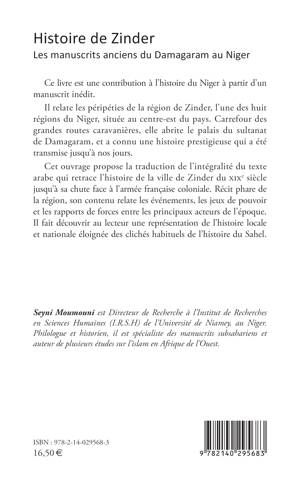 Ce livre est une contribution à l'histoire du Niger à partir d'un manuscrit inédit. Il relate les péripéties de la région de Zinder, l'une des huit régions du Niger, située au centre-est du pays. Carrefour des grandes routes caravanières, elle abrite le palais du sultanat de Damagaram, et a connu une histoire prestigieuse qui a été transmise jusqu'à nos jours. Cet ouvrage propose la traduction de l'intégralité du texte arabe qui retrace l'histoire de la ville de Zinder du xixe siècle jusqu'à sa chute face à l'armée française coloniale. Récit phare de la région, son contenu relate les événements, les jeux de pouvoir et les rapports de forces entre les principaux acteurs de l'époque. Il fait découvrir au lecteur une représentation de l'histoire locale et nationale éloignée des clichés habituels de l'histoire du Sahel.