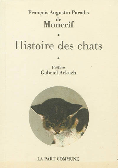 Publié en 1727 l'Histoire des chats de François-Augustin Paradis de Moncrif (1687-1770), contemporain de Voltaire, est le premier livre à plaider la cause des chats. Sur un ton à la fois frivole et sincère, burlesque et sérieux, il retrace la destinée du chat parmi les hommes, à travers les âges, qui de dieu devint diable avant d'être le compagnon fidèle et indépendant de nos foyers.