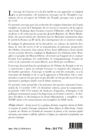 Le mystère des origines de l'esprit des templiers n'a pas été mis à jour à la manière originale de ce livre qui part à sa recherche à travers l'Histoire et la sagesse ancienne et ses passeurs de lumière. L'Ordre du Temple n'est ni né en 1118, ni mort en 1307; l'auteur met à plat mythes, légendes, idées préconçues et apparences. Cet ouvrage, fruit d'une longue recherche documentée, est le premier d'une trilogie (le deuxième balaie la période de 1307 à 1314 et le troisième de 1314, année du bûcher, à la Franc-Maçonnerie et aux ordres néo-templiers actuels). L'ouvrage parcourt l'Antiquité pour y croiser Jean-le-Baptiste, Jésus et Marie-Madeleine, St-Remy, puis Ste-Catherine, notamment, puis l'évolution de la chevalerie et de ses valeurs, la société féodale ; il analyse les secrets et les structures des Templiers, leur influence ou puissance et leurs mystères, leurs traditions, le sens de leur existence et les raisons d'une mutation nécessaire. Ce livre offre des clés de portes.