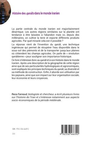 La partie centrale du monde iranien est majoritairement désertique. Les autres régions similaires sur la planète ont tendance à être laissées à l'abandon mais ici, depuis des millénaires, on cultive la terre et exporte différents produits agricoles. Par quel miracle cela est-il possible ? La réponse vient de l'invention du qanât, une technique ingénieuse qui permet de récupérer l'eau disponible dans le sous-sol des piémonts et de la transporter jusqu'aux plaines où s'étendent les champs agricoles. On parle de révolution qanâtienne pour souligner son importance historique. Ce livre s'intéresse donc au qanât et à son histoire dans le monde iranien. Après une description de la géographie de cette région ainsi que de ses particularités hydrologiques et agronomiques, sont expliqués les principes techniques du qanât, sa diversité et sa méthode de construction. Enfin, il aborde son utilisation par les paysans, ainsi que son impact sur leur organisation sociale, leur économie et leurs croyances.