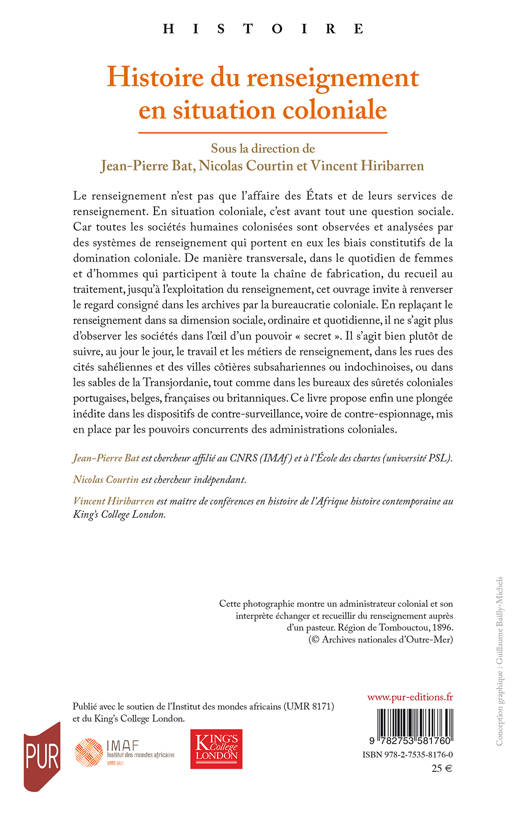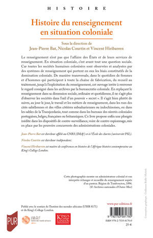 En replaçant le renseignement dans sa dimension sociale, ordinaire et quotidienne, ce livre suit au jour le jour le travail et les métiers de renseignement, dans les rues des cités sahéliennes et des villes côtières subsahariennes ou indochinoises, ou dans les sables de la Transjordanie, tout comme dans les bureaux des sûretés coloniales portugaises, belges, françaises ou britanniques. il propose une plongée inédite dans les dispositifs de contre-surveillance, voire de contre-espionnage, mis en place par les pouvoirs concurrents des administrations coloniales.