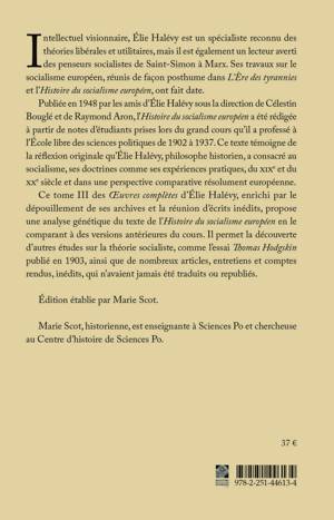 Intellectuel visionnaire, Elie Halevy est un specialiste reconnu des theories liberales et utilitaires, mais il est egalement un lecteur averti des penseurs socialistes de Saint-Simon a Marx. Ses travaux sur le socialisme europeen, reunis de facon posthume dans L'Ere des tyrannies et l'Histoire du socialisme europeen, ont fait date. Publiee en 1948 par les amis d'Elie Halevy sous la direction de Celestin Bougle et de Raymond Aron, l'Histoire du socialisme europeen a ete redigee a partir de notes d'etudiants prises lors du grand cours qu'il a professe a l'Ecole libre des sciences politiques de 1902 a 1937. Ce texte temoigne de la reflexion originale qu'Elie Halevy, philosophe historien, a consacre au socialisme, ses doctrines comme ses experiences pratiques, du XIXe et du XXe siecle et dans une perspective comparative resolument europeenne. Ce tome III des OEuvres completes d'Elie Halevy, enrichi par le depouillement de ses archives et la reunion d'ecrits inedits, propose une analyse genetique du texte de l'Histoire du socialisme europeen en le comparant a des versions anterieures du cours. Il permet la decouverte d'autres etudes sur la theorie socialiste, comme l'essai Thomas Hodgskin publie en 1903, ainsi que de nombreux articles, entretiens et comptes rendus, inedits, qui n'avaient jamais ete traduits ou republies.