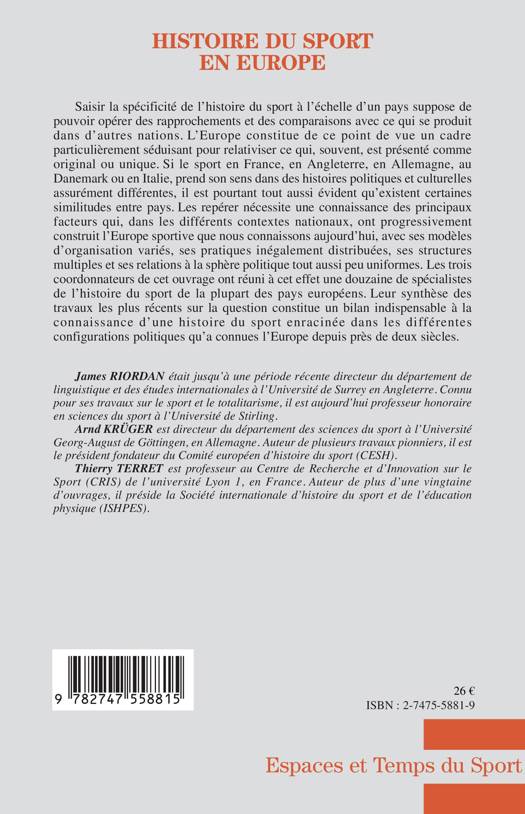 Saisir la spécificité de l'histoire du sport à l'échelle d'un pays suppose de pouvoir opérer des rapprochements et des comparaisons avec ce qui se produit dans d'autres nations. L'Europe constitue de ce point de vue un cadre particulièrement séduisant pour relativiser ce qui, souvent, est présenté comme original ou unique. Si le sport en France, en Angleterre, en Allemagne, au Danemark ou en Italie, prend son sens dans des histoires politiques et culturelles assurément différentes, il est pourtant tout aussi évident qu'existent certaines similitudes entre pays.