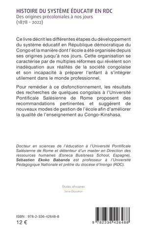 Ce livre décrit les différentes étapes du développement du système éducatif en République démocratique du Congo et la manière dont l'école a été organisée depuis ses origines jusqu'à nos jours. Cette organisation se caractérise par de multiples réformes qui révèlent son inadéquation aux réalités de la société congolaise et son incapacité à préparer l'enfant à s'intégrer utilement dans le monde professionnel. Pour remédier à ce disfonctionnement, les résultats des recherches de quelques congolais à l'Université Ponti cale Salésienne de Rome proposent des recommandations pertinentes et suggèrent de nouveaux modes de gestion de l'école afin d'améliorer la qualité de l'enseignement au Congo-Kinshasa.