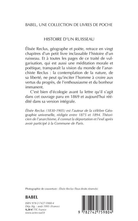 Elisée Reclus, géographe et poète, retrace en vingt chapitres d'un petit livre inclassable l'histoire d'un ruisseau. Et à toutes les pages de ce traité de vulgarisation qui est aussi une méditation morale et poétique, transparaît la vision du monde de l'anarchiste Reclus : la contemplation de la nature, de sa liberté, ne peut qu'inciter l'homme à croire aux vertus du progrès, de l'enthousiasme et du bonheur immanent. C'est bien d'écologie avant la lettre qu'il s'agit dans cet ouvrage paru en 1869 et aujourd'hui réédité dans sa version intégrale.