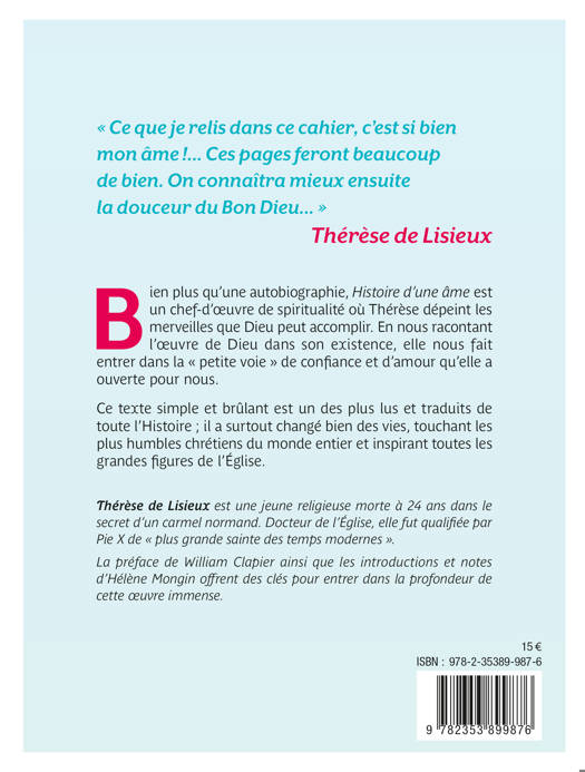 Bien plus qu’une autobiographie, Histoire d’une âme est un chef-d’œuvre de spiritualité où Thérèse dépeint les merveilles que Dieu peut accomplir. En nous racontant l’œuvre de Dieu dans son existence, elle nous fait entrer dans la « petite voie » de confiance et d’amour qu’elle a ouverte pour nous. Ce texte simple et brûlant est un des plus lus et traduits de toute l’Histoire , il a surtout changé bien des vies, touchant les plus humbles chrétiens du monde entier et inspirant toutes les grandes figures de l’Église.