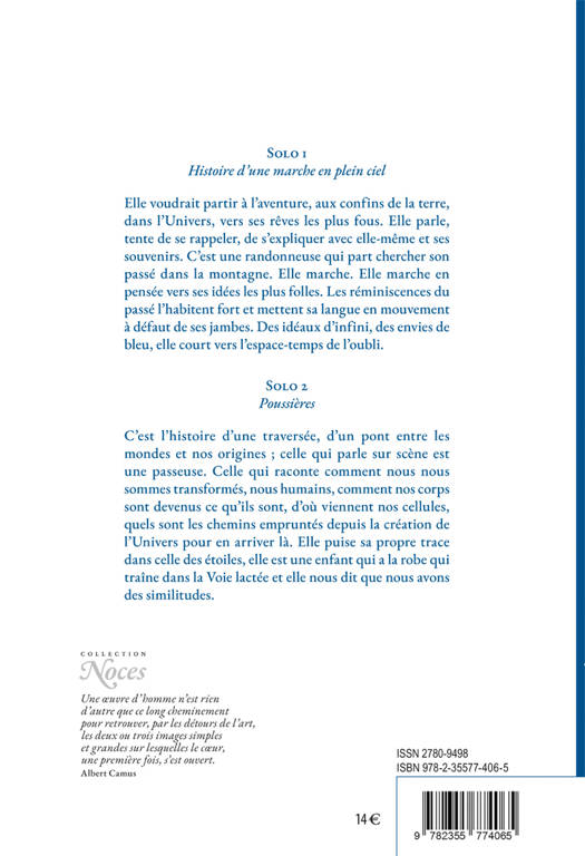 Dans ce premier diptyque paru à la rumeur libre, Eloïse Sekula explore les textes pour des actrices seules en scènes. Des femmes qui prennent la parole, dans une langue qui coule le long des fleuves de la pensée. Chacune a son histoire, chacune cherche à dire au présent ce qui lui arrive. Le théâtre est ici le lieu de la permission, celle de se perdre ou de se trouver. Où nous mènent les histoires de nos vies ? Il y a pour ces deux personnages féminins en plein essor mental, la nécessité de se raconter, de l'enfance au souvenir, du désir de vivre à la mort incertaine, de l'empreinte organique au passage vers le langage. L'autrice s'interroge sur le cycle de la mémoire : de quelle transmission cérébrale dépend le déni, comment construit-on sa propre réalité dans les méandres de l'imaginaire ?S'il y a bien une flèche à lancer, c'est celle-ci qu'elle veut tirer le plus loin possible : résister à l'oubli, écrire et ne pas mourir.