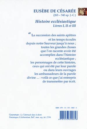 La succession des saints apôtres et les temps écoulés depuis notre Sauveur jusqu'à nous ; toutes les grandes choses que l'on raconte avoir été accomplies dans l'histoire ecclésiastique ; les personnages de cette histoire, ceux qui ont été par leur parole ou dans leurs ouvrages les ambassadeurs de la parole divine ... : voilà ce que j'ai entrepris de transmettre par écrit.