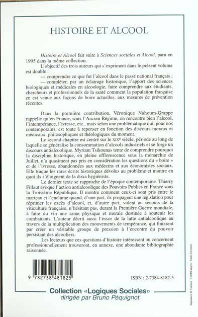 " Histoire et Alcool " fait suite à " Sciences sociales et Alcool ", (1995) et ses objectifs sont de comprendre ce que fut l'alcool dans le passé national français, de compléter par un éclairage historique l'apport des sciences biologiques et médicales en alcoologie et de faire comprendre aux étudiants, chercheurs et professionnels de la santé comment la population française en est venue aux façons de boire actuelles, aux mesures de prévention récentes.