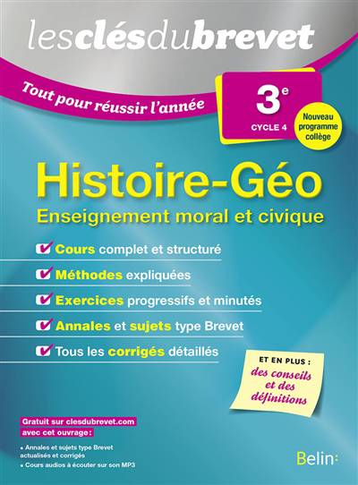 Des synthèses de cours, des méthodes de l'épreuve, des annales et sujets de type brevet, les corrigés détaillés ainsi que des quiz d'autoévaluation pour s'entraîner à l'examen d'histoire géographie et d'enseignement moral et civique. Des cours audio en format MP3 et des sujets type brevet sont téléchargeables en ligne.