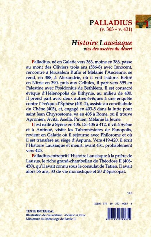 Palladius, né en Galatie vers 363, moine en 386, passe au mont des Oliviers trois ans (386-8) avec Innocent, rencontre à Jérusalem Rufin et Mélanie l'Ancienne, se rend, en 388, à Alexandrie, où il voit Isidore. Retiré en Nitrie en 390, puis aux Cellules, il part vers 399 en Palestine avec Posidonius de Bethléem. Il est consacré évêque d'Hélénopolis de Bithynie, au milieu de 400. Il prend part avec deux autres évêques à une enquête contre l'évêque d'Éphèse (401-2), assiste au conciliabule du Chêne (403), et, engagé en 403-5 dans la lutte pour saint Jean Chrysostome, va en 405 à Rome, où il trouve Apronien, Avita, Asella, Pinien, Mélanie la Jeune.