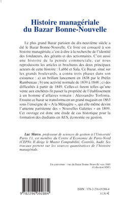 Ce livre est consacré à l'histoire managériale du plus grand Bazar parisien du dix-neuvième siècle. C'est aussi une histoire de la pensée commerciale, avec la reproduction d'articles et de brochures. Après un brillant lancement en 1838 par le Préfet de Paris puis une activité stable jusqu'en 1848, des difficultés surviennent à partir de 1849. Vendu aux enchères à un homme d'affaires romain, ce bazar devient grand magasin en 1863 sous l'enseigne "A la Ménagère" puis devient l'antenne parisienne des "Nouvelles Galeries" en 1899.