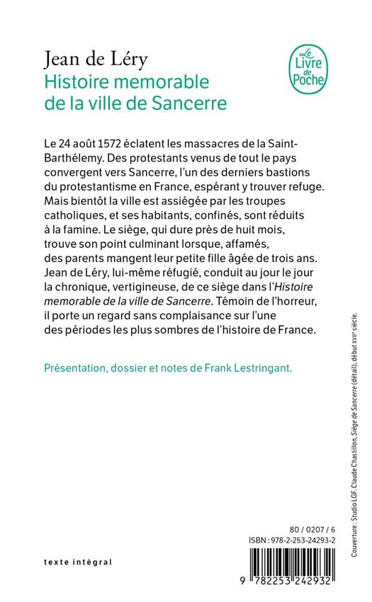 À la fin de l'été 1572 éclatent les massacres de la Saint-Barthélemy. Des protestants venus de tout le pays convergent vers Sancerre, l’un des derniers bastions du protestantisme en France, espérant y trouver refuge. Mais, bientôt, la ville est assiégée par les troupes catholiques, et ses habitants, confinés, sont réduits à la famine. Le siège, qui dure plus de huit mois, trouve son point culminant lorsque, affamés et au désespoir, des parents mangent le corps de leur petite fille décédée. Jean de Léry, réfugié à Sancerre pendant toute la durée du siège, en fait le récit au jour le jour dans un journal, qui deviendra plus tard l’Histoire memorable de la ville de Sancerre. Témoin de l’horreur, chroniqueur minutieux, il porte un regard sans complaisance sur l'une des périodes les plus sombres de l'histoire de France.