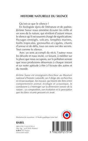 Qu'est-ce que le silence ? En biologiste épris de littérature et de poésie, Jérôme Sueur nous emmène écouter les mille et un sons de la nature, qui révèlent d'autant mieux le silence qu'il est souvent chargé de significations. Paysages enneigés, volcans, tempêtes marines, forêts tropicales, grenouilles et cigales, chants d'amour et de défis, tous ces sons ont des secrets. Tout comme le silence. Avec un sens accompli du récit, l'auteur nous les dévoile et nous invite, ce faisant, à méditer sur la place que nous occupons, sur la pollution sonore que nous produisons désormais à chaque instant et sur notre aptitude à être à l'écoute des autres et du monde.