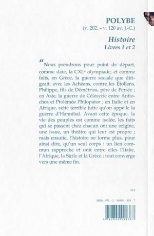 Nous prendrons pour point de départ, comme date, la CXLe olympiade, et comme faits, en Grèce, la guerre sociale que dirigeait, avec les Achéens, contre les Étoliens, Philippe, fils de Démétrios, père de Persée ; en Asie, la guerre de Célésyrie entre Antiochos et Ptolémée Philopator ; en Italie et en Afrique, cette terrible lutte qu'on appelle la guerre d'Hannibal. Avant cette époque, la vie des peuples est comme isolée, les faits qui se passent chez chacun ont une origine, une issue, un théâtre qui leur est propre ; mais ensuite, l'histoire ne forme plus, pour ainsi dire, qu'un seul corps : un lien commun rapproche et unit entre elles l'Italie, l'Afrique, la Sicile et la Grèce ; tout converge vers une même fin.