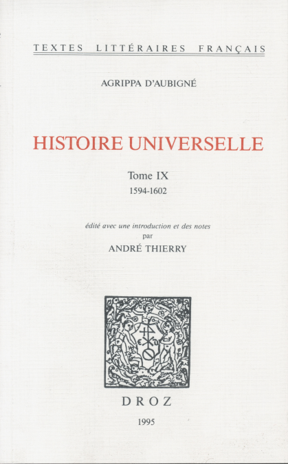 C’est en 1620 lorsqu’il trouve refuge à Genève qu’Agrippa d’Aubigné entreprend de réviser son Histoire Universelle en trois tomes. Amplement corrigée et augmentée, c’est cette seconde version qui est ici éditée, suivant le découpage de Ruble en XV livres. On trouvera dans le dixième et dernier volume de la présente édition le quatrième tome qu’Agrippa d’Aubigné entreprenait d’adjoindre à son ouvrage mais qu’il ne put achever avant la fin de sa vie. Conservés dans les Archives Tronchin, ces textes furent publiés pour la première fois, de manière lacunaire, en 1925, par Jean Plattard. Ces ultima scripta brossent l’image d’un homme à qui le grand âge n’avait rien ôté de la vigueur de son « gros style ferré » et qui demeurait inébranlablement fidèle à la cause pour laquelle il s’était jeté dans la guerre soixante-deux ans plus tôt.
