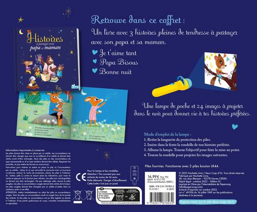 • Une lampe de poche et 24 images à projeter dans le noir pour donner vie à tes histoires préférées.