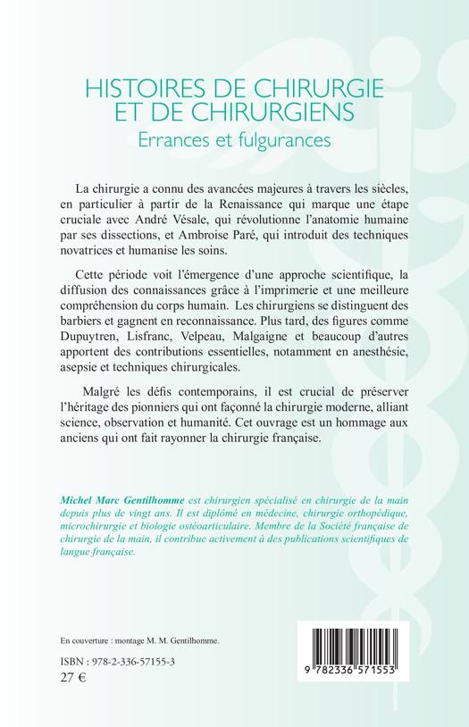 La chirurgie a connu des avancées majeures à travers les siècles, en particulier à partir de la Renaissance qui marque une étape cruciale avec André Vésale, qui révolutionne l'anatomie humaine par ses dissections, et Ambroise Paré, qui introduit des techniques novatrices et humanise les soins. Cette période voit l'émergence d'une approche scientifique, la diffusion des connaissances grâce à l'imprimerie et une meilleure compréhension du corps humain. Les chirurgiens se distinguent des barbiers et gagnent en reconnaissance. Plus tard, des figures comme Dupuytren, Lisfranc, Velpeau, Malgaigne et beaucoup d'autres apportent des contributions essentielles, notamment en anesthésie, asepsie et techniques chirurgicales. Malgré les défis contemporains, il est crucial de préserver l'héritage des pionniers qui ont façonné la chirurgie moderne, alliant science, observation et humanité. Cet ouvrage est un hommage aux anciens qui ont fait rayonner la chirurgie française.