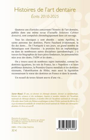 Quatorze ans d'articles concernant l'histoire de l'art dentaire, publiés dans une même revue (l'actuelle Solutions Cabinet dentaire), sont compulsés chronologiquement dans cet ouvrage. Tous les classiques y sont abordés: sainte Apolline, la sainte patronne des dentistes, Pierre Fauchard évidemment, la fée des dents... De l'Antiquité à nos jours, un grand nombre de thématiques sont illustrées: la première fois en implantologie ou dans de nombreuses autres disciplines (parodontologie...) à travers les biographies de leurs pères fondateurs, les personnalités nées avec des dents, l'ADN et les dents... On y trouve aussi de nombreux sujets inattendus, comme les dentistes égyptiens, les rois de France, les Napoléon et leurs problèmes dentaires, la Première Guerre mondiale et les dentistes résistants, l'identification de Hitler, mais aussi la législation reconnaissant le statut des dentistes en France et dans le monde. Un recueil de textes faisant oeuvre d'une vie...