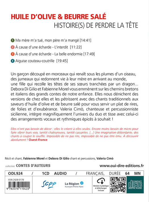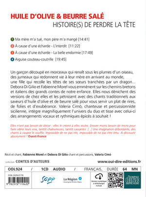 Dans l'univers du conte, quelques arbres cachent la forêt : le succès de Perrault, Grimm et Walt Disney a fait oublier la grande richesse et la variété des motifs traditionnels. Fabienne Morel et Debora Di Gilio vous emmènent sur les chemins bretons et italiens des grands contes de notre enfance. Elles vous dénichent des versions de chez elles et les pétrissent avec des chants traditionnels aux saveurs d'huile d'olive et de beurre salé pour vous servir un plat de rires, de folies et d'exubérances.