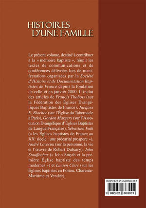 Le présent volume, destiné à contribuer à la « mémoire baptiste », réunit les textes de communications et de conférences délivrées lors de manifestations organisées par la Société d’Histoire et de Documentation Baptistes de France depuis la fondation de celle-ci en janvier 2000. Il inclut des articles de Francis Thobois (sur la Fédération des Églises Évangéliques Baptistes de France), Jacques Blocher (sur l’Église du Tabernacle à Paris), Gordon Margery (sur l’Association Évangélique d’Églises baptistes de Langue Française), Sébastien Fath (« les Églises baptistes de France au XXe siècle : une précarité prospère »), André Loverini (sur la personne, la vie et l’œuvre de Robert Dubarry), John Stauffacher (« John Smyth et la première Église baptiste des temps modernes ») et Lucien Clerc (sur les Églises baptistes en Poitou, Charente-Maritime et Vendée).