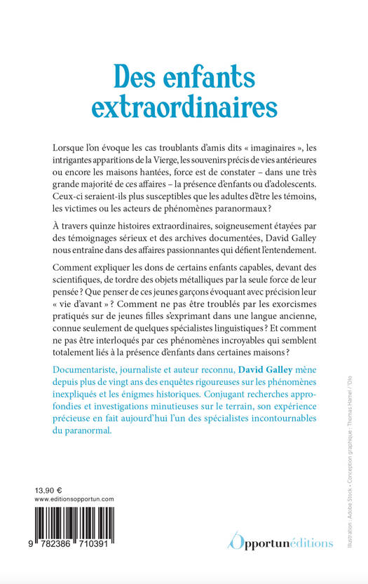 Comment expliquer les dons de certains enfants capables, devant des scientifiques, de tordre des objets métalliques par la seule force de leur pensée ? Que penser de ces jeunes garçons évoquant avec précision leur « vie d’avant » ? Comment ne pas être troublés par les exorcismes pratiqués sur de jeunes filles s’exprimant dans une langue ancienne, connue seulement de quelques spécialistes linguistiques ? Et comment ne pas être interloqués par ces phénomènes incroyables qui semblent totalement liés à la présence d’enfants dans certaines maisons ?