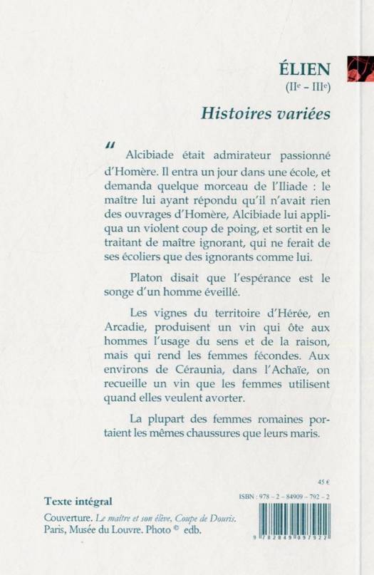 « Alcibiade était admirateur passionné d'Homère. Il entra un jour dans une école, et demanda quelque morceau de l'Iliade : le maître lui ayant répondu qu'il n'avait rien des ouvrages d'Homère, Alcibiade lui appliqua un violent coup de poing, et sortit en le traitant de maître ignorant, qui ne ferait de ses écoliers que des ignorants comme lui.