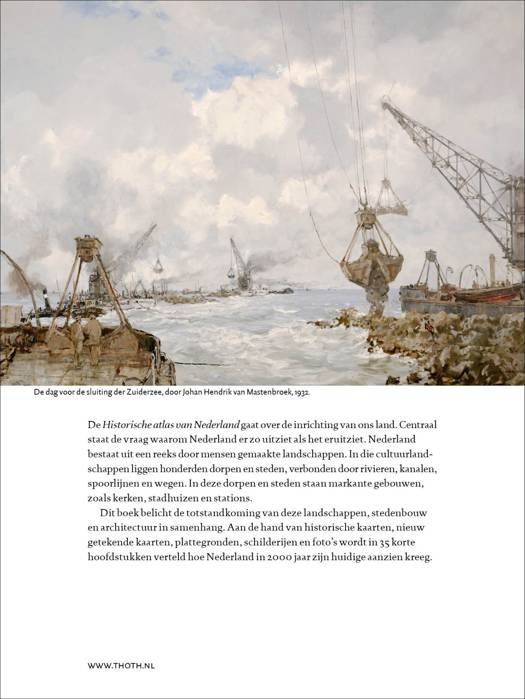De Historische atlas van Nederland gaat over de inrichting van ons land. Centraal staat de vraag waarom Nederland er zo uitziet als het er uitziet. Nederland bestaat uit een reeks door mensen gemaakte landschappen. In die cultuurlandschappen liggen honderden dorpen en steden, verbonden door rivieren, kanalen, spoorlijnen en wegen. In die dorpen en steden staan markante gebouwen, zoals kerken, stadhuizen en stations. Dit boek belicht de totstandkoming van deze landschappen, stedenbouw en architectuur in samenhang. Aan de hand van historische kaarten, nieuw getekende kaarten, plattegronden, schilderijen en foto's wordt in 35 korte hoofdstukken verteld hoe Nederland in 2000 jaar zijn huidige aanzien kreeg.