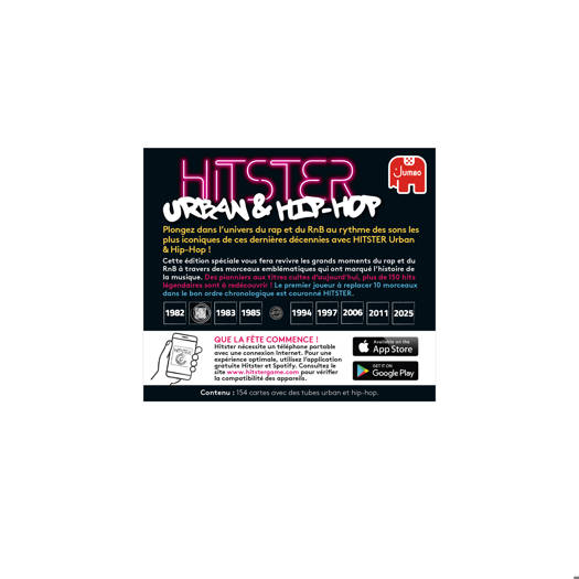 Maak je klaar om de muziek te laten knallen met Hitster Urban & Hip - Hop! Deze editie is een eerbetoon aan de grootste namen in de urban muziek, met klassieke hiphop, R&B en moderne raphits. Scan een muziekkaart met de gratis app, raad het jaar van uitgave, de artiest en de titel van het nummer, en bouw je ultieme hiphop - tijdlijn. Van gouden - era klassiekers tot de huidige toppers, daag je vrienden uit en laat zien wie de baas is. De eerste speler die 10 nummers correct op volgorde weet te leggen, wordt gekroond tot Urban & Hip - Hop Hitster Kampioen! Deze nieuwste versie van Hitster komt in een kleinere doos met 150+ kaartjes. De ideale uitbreidingsset voor jouw favoriete muziekspel! Het spel is wel als los spel te spelen, je hebt niet perse de andere edities nodig. Er zitten alleen geen tokens in deze editie. Zo speel je het: Kies een muziekkaart en scan de QR - code met de Hitster app om het lied automatisch af te spelen op Spotify. Raad wanneer het nummer is uitgebracht en plaats de kaart op de juiste plaats in jouw muziektijdlijn. Draai de muziekkaart om. Heb je het jaartal goed geraden? Dan hou je de muziekkaart om je tijdlijn verder mee uit te bouwen. Verschillende speelniveaus: Hitster heeft verschillende speelniveaus, zo is het spel voor iedere muziekliefhebber een uitdaging! Original: Instant Party! Leg de muziekkaarten op de juiste plek in jouw muziektijdlijn. Pro: Jij kent je muziek! Laat zien hoe goed je artiesten en hun liedjes kent. Expert: Hardcore Hitster! Je houdt van muziek en kent de titel, artiest en jaar uit je hoofd! Werk samen! Creëer samen met jouw vrienden één muziektijdlijn.