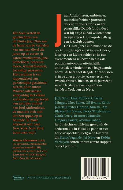 Dit boek vertelt de geschiedenis van de Hnita Jazz Club aan de hand van de verhalen van mensen die al die jaren op de eerste rij zaten: muzikanten, jazzliefhebbers, bestuursleden, sympathisanten, toevallige passanten. Het resultaat is een lappendeken van persoonlijke geschiedenissen, door auteur Wouter Adriaensen zorgvuldig met elkaar verbonden en afgetoetst aan het rijke archief van Juul Anthonissen, de man die zich ooit liet betrappen op de boutade ‘Ik moet helemaal niet naar New York, New York komt naar mij!’. Juul Anthonissen, ambtenaar, muziekliefhebber, journalist, docent en voorzitter van het plaatselijke Davidsfonds, deed wat hij altijd al had willen doen: in zijn eigen Heist-op-den-Berg een jazzclub openen.De Hnita Jazz Club huisde na de oprichting in 1955 eerst in een kelder, later op een kleine zolder en in een evenementenzaal boven het lokale politiekantoor, om uiteindelijk onderdak te vinden in een leegstaande hoeve. Al heel snel slaagde Anthonissen erin de allergrootste jazzartiesten een tweede thuis te bieden. In de jazzscene werd Heist-op-den-Berg stilaan het New York aan de Nete. Jack Sels, Hank Mobley, Charles Mingus, Chet Baker, Gil Evans, Keith Jarrett, Dexter Gordon, Sun Ra, Art Blakey, Bill Evans, Toots Thielemans, Clark Terry, Branford Marsalis, Gregory Porter, Avishai Cohen, het is slechts een kleine greep uit de artiesten die in Heist de pannen van het dak speelden. Belgische talenten als Frank Vaganée, Jef Neve en Robin Verheyen zetten er hun eerste stappen op het podium.