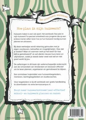 Leer effectief school- en huiswerk plannen en maken Huiswerk maken is een vak apart. Het werkboek Hoe plan ik mijn huiswerk? is speciaal ontwikkeld voor jongeren die op een actieve manier willen leren hoe ze hun huiswerk handig kunnen plannen en uitvoeren. Bij deze werkwijze wordt rekening gehouden met je eigen voorkeuren, behoeftes en mogelijkheden. Hoe stel je doelen? Waar en wanneer werk je het best? En hoe blijf je gemotiveerd? Je zult allerlei nieuwe trucs leren en uitproberen, zodat je steeds beter weet wat wel en niet goed werkt bij jou. De oefeningen in dit boek zijn wetenschappelijk onderzocht aan de Universiteit van Amsterdam en bewezen effectief om te leren plannen, organiseren en gemotiveerd te blijven. Een onmisbaar hulpmiddel voor huiswerkbegeleiders, mentoren, leerlingbegeleiders en studiecoaches.