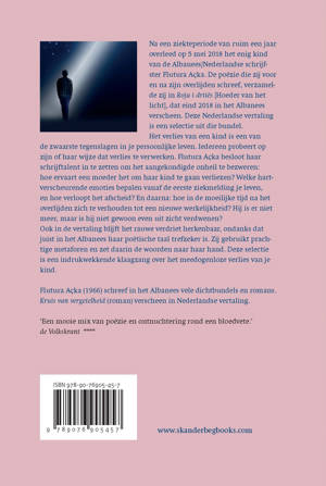 Na een ziekteperiode van ruim een jaar overleed op 5 mei 2018 het enig kind van de Albanees/Nederlandse schrijfster Flutura Açka. De poëzie die zij voor en na zijn overlijden schreef, verzamelde zij in Roja i dritës [Hoeder van het licht], dat eind 2018 in het Albanees verscheen. Deze Nederlandse vertaling is een selectie uit die bundel. Het verlies van een kind is een van de zwaarste tegenslagen in je persoonlijke leven. Iedereen probeert op zijn of haar wijze dat verlies te verwerken. Flutura Açka besloot haar schrijftalent in te zetten om het aangekondigde onheil te bezweren: hoe ervaart een moeder het om haar kind te gaan verliezen? Welke hartverscheurende emoties bepalen vanaf de eerste ziekmelding je leven, en hoe verloopt het afscheid? En daarna: hoe in de moeilijke tijd na het overlijden zich te verhouden tot een nieuwe werkelijkheid? Hij is er niet meer, maar is hij niet gewoon even uit zicht verdwenen? Ook in de vertaling blijft het rauwe verdriet herkenbaar, ondanks dat juist in het Albanees haar poëtische taal trefzeker is. Zij gebruikt prachtige metaforen en zet daarin de woorden naar haar hand. Deze selectie is een indrukwekkende klaagzang over het meedogenloze verlies van je kind.