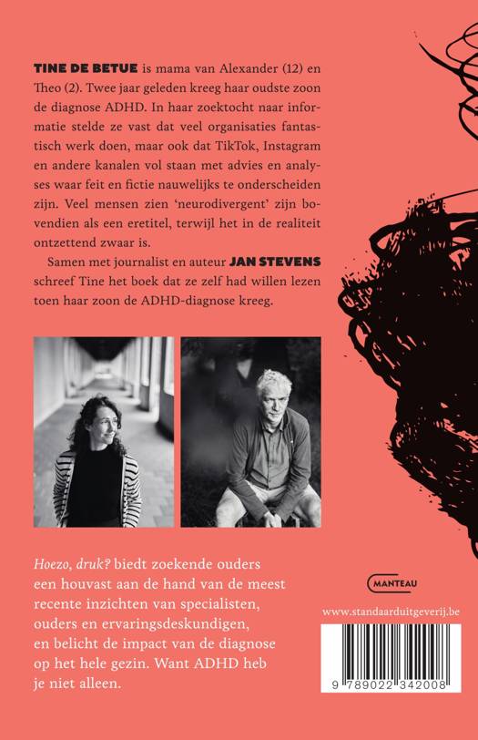 Tine De Betue is mama van Alexander (12) en Theo (2). Twee jaar geleden kreeg haar oudste zoon de diagnose ADHD. In haar zoektocht naar informatie stelde ze vast dat veel organisaties fantastisch werk doen, maar ook dat TikTok, Instagram en andere kanalen vol staan met advies en analyses waar feit en fictie nauwelijks te onderscheiden zijn. Veel mensen zien 'neurodivergent' zijn bovendien als een eretitel, terwijl het in de realiteit ontzettend zwaar is. Samen met journalist en auteur Jan Stevens schreef Tine het boek dat ze zelf had willen lezen toen haar zoon de ADHD-diagnose kreeg.