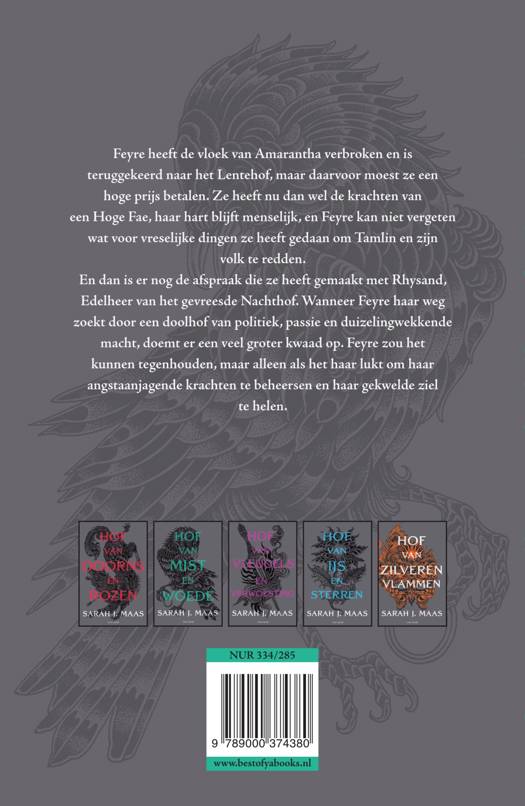 Feyre heeft de vloek van Amarantha verbroken en is teruggekeerd naar het Lentehof, maar daarvoor moest ze een hoge prijs betalen. De vreselijke dingen die ze heeft gedaan om Tamlin te redden kan niet ze vergeten en ook haar afspraak met Rhysand, Edelheer van het gevreesde Nachthof, heeft ze maar al te goed onthouden. Terwijl Feyre haar weg zoekt door een doolhof van politiek, passie en duizelingwekkende macht, doemt er een veel groter kwaad op. Feyre zou het kunnen tegenhouden, maar alleen als het haar lukt om haar angstaanjagende krachten te beheersen en haar gekwelde ziel te helen.