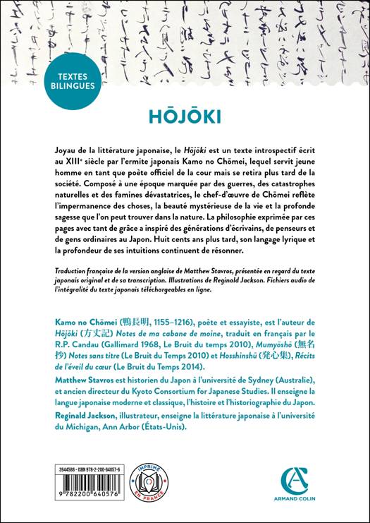 Joyau de la littérature japonaise, H j ki est un texte introspectif écrit au XIIIe siècle par l'ermite japonais Kamo no Chômei, qui, jeune homme, servit dans la capitale en tant que poète officiel de la cour, mais qui, plus tard, se retira de la société. Composé à une époque marquée par des guerres, des incendies, des inondations, des tremblements de terre, des sécheresses et des famines dévastatrices, le chef-d'oeuvre de Chomei reflète l'impermanence des choses, la beauté mystérieuse de la vie et la profonde sagesse que l'on peut trouver dans la nature. Chomei brosse un tableau saisissant du chaos et de la souffrance de la condition humaine. Au milieu de cette agitation, il découvre une oasis de calme dans une simple cabane de montagne, où il contemple les vertus de la nature et la beauté wabi sabi de l'imperfection en toutes choses.