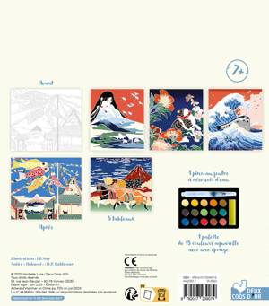 Découvre dans cette pochette tout le nécessaire pour réaliser 5 tableaux inspirés des œuvres d’Hokusai. En suivant le mode d’emploi, il suffit de peindre les différents tableaux à l’aide de la palette d’aquarelle et du pinceau feutre fourni. Grâce à l’impression en vernis pailleté brillant, la peinture n’adhère pas sur le dessin, pour un résultat encore plus spectaculaire !