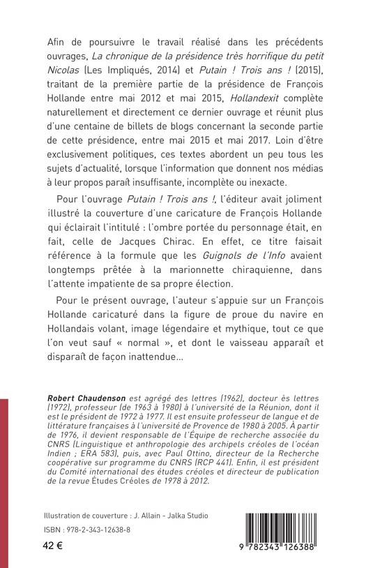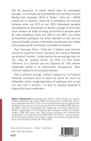 Afin d'achever le travail recensé dans les précédents tomes "La chronique de la présidence très horrifique du Petit Nicolas " en 2014 et " Putain ! Trois ans ! " en 2015, Robert Chaudenson réunit ses billets de blogs sur la seconde partie de la présidence de François Hollande. Loin d'être exclusivement politique, cette chronique aborde de nombreux sujets d'actualité, lorsque l'information que donnent les médias à leur propos paraît insuffisante, incomplète ou inexacte.