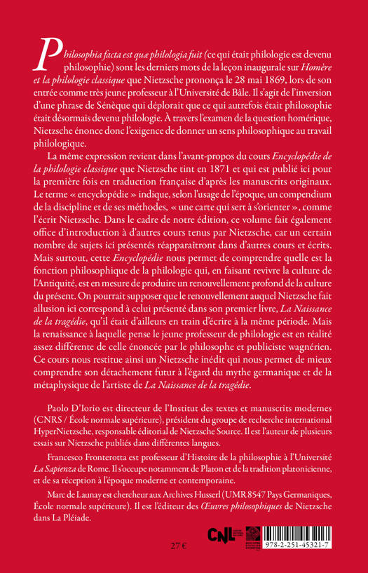 Philosophia facta est quAe philologia fuit (ce qui etait philologie est devenu philosophie) sont les derniers mots de la lecon inaugurale sur Homere et la philologie classique que Nietzsche prononca le 28 mai 1869, lors de son entree comme tres jeune professeur a l'Universite de Bale. Il s'agit de l'inversion d'une phrase de Seneque qui deplorait que ce qui autrefois etait philosophie etait desormais devenu philologie. A travers l'examen de la question homerique, Nietzsche enonce donc l'exigence de donner un sens philosophique au travail philologique. La meme expression revient dans l'avant-propos du cours Encyclopedie de la philologie classique que Nietzsche tint en 1871 et qui est publie ici pour la premiere fois en traduction francaise d'apres les manuscrits originaux. Le terme encyclopedie indique, selon l'usage de l'epoque, un compendium de la discipline et de ses methodes, une carte qui sert a s'orienter, comme l'ecrit Nietzsche. Dans le cadre de notre edition, ce volume fait egalement office d'introduction a d'autres cours tenus par Nietzsche, car un certain nombre de sujets ici presentes reapparaitront dans d'autres cours et ecrits. Mais surtout, cette Encyclopedie nous permet de comprendre quelle est la fonction philosophique de la philologie qui, en faisant revivre la culture de l'Antiquite, est en mesure de produire un renouvellement profond de la culture du present. On pourrait supposer que le renouvellement auquel Nietzsche fait allusion ici correspond a celui presente dans son premier livre, La Naissance de la tragedie, qu'il etait d'ailleurs en train d'ecrire a la meme periode. Mais la renaissance a laquelle pense le jeune professeur de philologie est en realite assez differente de celle enoncee par le philosophe et publiciste wagnerien. Ce cours nous restitue ainsi un Nietzsche inedit qui nous permet de mieux comprendre son detachement futur a l'egard du mythe germanique et de la metaphysique de l'artiste de La Naissance de la tragedie.