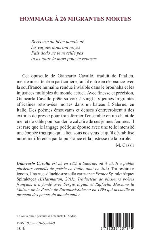 Cet opuscule de Giancarlo Cavallo, traduit de l’italien, mérite une attention particulière, tant il entre en résonance avec la souffrance humaine rendue invisible dans le brouhaha et les injustices multiples du monde actuel. Avec finesse et précision, Giancarlo Cavallo prête sa voix à vingt-six jeunes migrantes africaines retrouvées mortes dans un bateau à Salerne, en Italie. Des poèmes émouvants et denses s’entrecroisent à des extraits de presse pour transformer l’ensemble en un chant de mer et de sable pour sonder le calvaire de ces jeunes femmes. Il est rare que le langage poétique épouse avec une telle intensité une épopée tragique qui a lieu sous nos yeux et qu’il déstabilise notre indifférence par la puissance et la justesse de la parole.