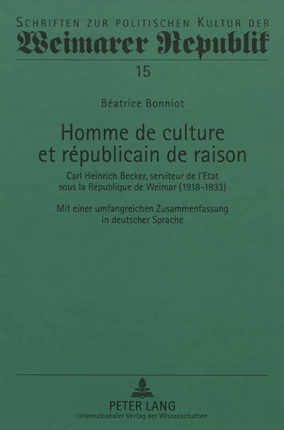 Issu de la bourgeoisie libérale et cultivée de l'Allemagne de Guillaume II, C. H. Becker (1876-1933) est de ces républicains de raison qui, après l'effondrement de 1918, s'attellent avec pragmatisme à la reconstruction, au service de la solution de fortune qu'est à leurs yeux la première République allemande. Il s'agit ici d'interroger l'attachement de ce « ministre de l'esprit » à la République de Weimar et d'éclairer ainsi le concept de républicain de raison.