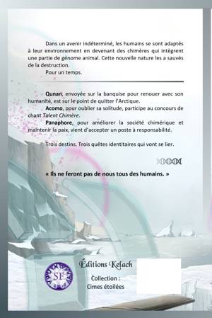 Dans un avenir indéterminé, les humains se sont adaptés à leur environnement en devenant des chimères qui intègrent une partie de génome animal. Cette nouvelle nature les a sauvés de la destruction. Pour un temps. Qunan, envoyée sur la banquise pour renouer avec son humanité, est sur le point de quitter l'Arctique. Acomo, pour oublier sa solitude, participe au concours de chant Talent Chimère. Panaphore, pour améliorer la société chimérique et maintenir la paix, vient d'accepter un poste à responsabilité. Trois destins. Trois quêtes identitaires qui vont se lier. « Ils ne feront pas de nous tous des humains. »